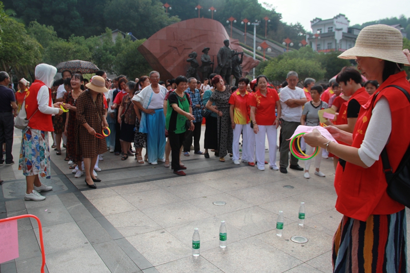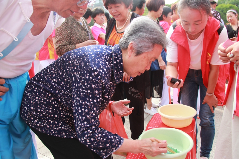 老年朋友排隊(duì)玩“圈套” 胡燕芬/攝 歡慶活動(dòng)現(xiàn)場一片熱鬧,有老年人組成的太極拳表演、康姿百德健身操以及歌舞表演,夢筆生花民樂團(tuán)的老年朋友還帶來了器樂合奏,一拉一唱的歌唱組合將整個(gè)活動(dòng)推向高潮。此外,為增加活動(dòng)樂趣,調(diào)動(dòng)老年朋友參與活動(dòng)的熱情,主辦方還準(zhǔn)備了“夾彈珠”“圈套”“丟沙包”等各式自由游戲活動(dòng),廣場洋溢著歡樂的氣氛。