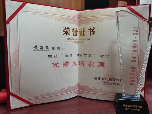 黃海文父子合照 6月20日,省婦聯宣傳部為紀念“三八”國際婦女節110周年暨“悅讀·家@萬家”總結活動,在福建大劇院舉辦“悅讀· 家@萬家”總結頒獎典禮,省婦聯主席等領導為2019年“悅讀· 家@萬家”活動中設區市前三名的30位家庭頒獎,松溪公路分局黃海文榮獲福建省優秀悅讀家庭表彰。