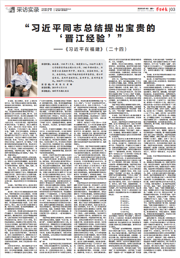 采訪對象:施永康,1945年1月生,福建晉江人。1968年從廈門大學經濟系畢業后到江西工作,1982年調回晉江,歷任晉江縣委組織部干事、副縣長、縣委副書記、縣長、縣委書記。1992年起歷任泉州市委常委、晉江市委書記、泉州市委副書記、泉州市長、泉州市委書記。2008年12月退休。 采 訪 組:邱 然 陳 思 黃 珊 采訪日期:2019年8月31日 采訪地點:福州市西湖大酒店 采訪組:施永康同志,您好!上世紀90年代初,習近平同志在福州任市委書記期間,您在泉州市任市委常委、晉江市委書記。你們當時是如何認識的? 施永康:1992年,習近平同志是福州市委書記,我是泉州市委常委兼晉江市委書記,之前我們在工作上沒有什么接觸。那一年,去北京參加黨的十四大時,我們兩人都是黨的十四大代表,同在福建代表團,就在會上認識了。 我對我倆最初認識的場景印象很深刻。在人民大會堂,一次會議結束后,習近平同志很親切地對我說:“永康同志,晉江發展得很快,很好,你們在第一線很不容易,很辛苦。”他很魁梧,個子比我高了一截,我仰著頭說:“是啊,晉江風風雨雨的,事情也很多?!碑敃r,晉江出了一個藥案,影響很壞,我們組織查這個案子下了很大力氣。但是,當官為民辦事,干起工作來哪有什么輕松的呢?想到這里,我說:“習書記,您在寧德老少邊窮地區工作過,也很辛苦,很不容易?!睂幍履莻€時候的狀況和泉州截然不同,單從經濟來說,福建省9個地市有6個地市的財政收入都不如一個晉江縣,寧德作為老少邊窮地區,更是差得很遠。習近平同志說:“是啊,有機會我帶干部到你們那邊去學習取經?!蔽艺f:“好的,歡迎來指導?!?/span> 后來,我聽福建代表團另外一位同志說,在會議期間,習近平同志對晉江的情況非常關心,聽到有人討論晉江的問題時,他會非常專注地聽。我們第一次見面,習近平同志給我留下了非常好的印象,他年輕、成熟、穩重、睿智、干練、務實,待人和藹親切。 我們既然認識了,彼此印象又都不錯,回到福建以后打交道就多了起來。特別是他調到省里工作以后,我們在省委全會上經常見面,之后都會聊聊天。他一直很關心晉江的情況。我們一見面就談工作,他向我了解晉江各項事業的發展,我也經常把工作中的煩惱向他匯報。 采訪組:習近平同志為什么一直關注晉江的發展?他當省委副書記后對晉江有過哪些支持? 施永康:晉江本來在福建也是比較有名的地方,7000年前就有人類在這里居住,歷史悠久。春秋戰國時期,晉江是古越族人繁衍生息的地方。到了南宋時期,北方戰亂,晉江也成為南渡漢人的一個重要落腳點。到了清末和近現代,晉江的海外移民越來越多,又成了重要的僑鄉。所以,晉江在改革開放后的繁榮發展,有歷史文化因素,也有自然地理因素,是多方面因素綜合作用的結果。 改革開放后,晉江群眾自發嘗試過多種生產發展路子,其中代表性的有兩種。第一種是磁灶模式。磁灶鎮在歷史上就生產陶瓷遠銷海外,已經開拓形成了相對穩定的市場需求。這種模式的路子是:原材料—技術—市場。第二種是陳埭模式。陳埭鎮處于肥沃的晉東平原,工業企業沒有基礎,他們組織生產當時中國社會短缺的肥皂、火柴等日用品,填補國內市場空白。這種模式的路子是:市場—技術—原材料。敢想敢干的晉江人充分發揮這兩種模式的經驗,走遍全國去做市場調查,了解市場需求,回來之后就組織原材料,再聘用工程技術人員針對市場需求進行生產。后來,晉江生產的服裝鞋帽、日用品等豐富多彩的商品,遠銷全國各地甚至海外,形成了晉江整體的一種發展模式。 20世紀90年代初,我們國家經過十幾年的改革開放,面貌有了很大變化。特別是廣大農村,變化更是天翻地覆。我國社會學和人類學奠基人之一費孝通先生走遍大江南北,考察廣大農村發展情況,自北而南總結出了蘇南模式(指蘇南的蘇州、無錫、常州和南通等地通過發展鄉鎮企業實現非農化發展的方式)、溫州模式(指浙江省東南部的溫州地區以家庭工業和專業化市場的方式發展非農產業,從而形成小商品、大市場的發展格局)、耿車模式(江蘇省宿遷市耿車鎮在中國不發達農業地區發展鄉鎮企業的一種模式)、晉江模式。自此經濟學界和理論界紛紛展開研究。其后,中國社會科學院的陸學藝研究員自北而南系統考察了中國廣大農村,最后提出蘇南模式、溫州模式、晉江模式、珠江模式,是中國農村發展的代表模式。 1994年,中國農村發展道路(晉江)研討會召開,中央財經領導小組、中央政策研究室、國務院發展研究中心、國務院研究室、中央黨校、中國社會科學院及福建周邊十個省的“三農”問題專家參會,把各地的發展模式放在一起交流比較。晉江模式和蘇南模式、溫州模式、珠江模式都不一樣。晉江模式以市場調節、股份合作制、外向型經濟為主,同時兼顧多種經濟成分共同發展。由于晉江模式特別適合當時生產力發展水平,尤其是高度適合晉江本地的實際情況,因此得到費孝通、陸學藝等專家學者的高度重視。 1995年,習近平同志擔任福建省委副書記,開始分管全省的“三農”等工作。上任后不久,他就來晉江調研,聽取我們的工作匯報。我匯報說,晉江農業的比重只剩下百分之三點多。習近平同志對這個情況很重視。他說,晉江這些年發展得比較快,取得了可喜成績,但我們國家始終是農業大國,還是要更加注重農業的發展,否則恐怕會導致