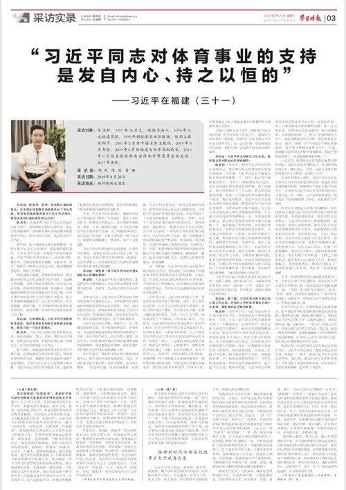 采訪對象:陳忠和,1957年10月生,福建龍海人。1976年入選福建男排,1995年調任國家女排教練,協助主教練郎平。2001年2月任中國女排主教練,2009年3月卸任。2009年6月任福建省體育局副局長。2016年9月任省政協港澳臺僑和外事委員會副主任。2017年退休。 采 訪 組:邱 然 陳 思 黃 珊 采訪日期:2019年8月26日 采訪地點:福州西湖大酒店 采訪組:陳指導,您好!您長期從事排球事業,為中國女排取得優異成績作出了突出貢獻。聽說您在福建期間就與習近平同志相識,請您講講你們最初是怎樣認識的? 陳忠和:我最初和習近平同志見面是在1996年前后,那時候他任福州市委書記。我認識他純屬偶然。原國家女排隊員陳招娣來福建看望習書記,我有幸陪同前往,就這樣認識了習書記。 那時候,我已到國家女排任助理教練,見到市委書記這么大的領導,還是感到挺拘束的,幾乎沒說什么話。給我留下深刻印象的是,習近平同志非常平易近人,說話很平和、很樸實,讓我覺得他很好接觸,也很親切。后來,我們在不同場合又見過幾次,彼此慢慢熟悉起來,就成了好朋友。 我的老家在福建。我每次回家探親,路過福州時經常會專程去看望習近平同志。見面聊天的話題,當然大多是中國女排,有時也會談到其他一些體育項目的事情。每次聊天,我都能感覺到他對中國女排很關注也很了解,當時女排隊員的名字和主力隊員的打法特點、場上位置他都能娓娓道來,這讓我非常驚訝,也非常敬佩。就我了解,在當時體育界以外的省部級領導中,還沒有哪一位對中國女排有如此深入的了解。 采訪組:大家都知道,習近平同志很喜歡體育運動,他對競技體育和群眾體育都非常重視。請您介紹一下這方面情況。 陳忠和:習近平同志確實很喜歡體育運動,他喜歡游泳、登山、足球,偶爾也打打網球,雖然沒打過排球,但他對排球運動一直很關注,對中國女排更是十分關心。 那個時候,福建省的體育事業相對而言不那么強,迫切需要社會各方面的支持,更需要省里領導的支持。福建原來的競技體育成績不是很理想,在第八屆全運會上僅獲得5枚金牌。習近平同志當時主持省政府工作,他看到了福建競技體育方面的短板,有針對性地推出了多項舉措振興福建的競技體育。 比如,在習近平同志推動下,福建省部級以上領導都對口幫助一個競技隊。他本人擔任省技巧、體操協會名譽會長,親自幫助協調資金、訓練、人事、編制等問題,大力支持并推動全省競技體育大發展。這個措施效果很好,可以說是立竿見影,在接下來的那一屆全運會上,福建的金牌數翻了一番還多,拿下十幾枚金牌。 習近平同志對群眾體育也很重視。在擔任省長期間,還兼任省登山協會名譽主席。他說,當這個名譽主席可以帶動群眾一起健身。從這件事情上,可以看到他對人民群眾的感情和對群眾體育事業的重視。 采訪組:請您講一講習近平同志對中國女排的關心有哪些事例? 陳忠和:無論是郎平擔任主教練期間,還是我擔任主教練期間,習近平同志都曾多次看望中國女排,在訓練、生活各方面給予關心和幫助。 2000年11月,習近平同志專程到漳州女排訓練基地召開現場辦公會,主要是研究給漳州基地新建訓練場館和運動員宿舍。當時,漳州基地比較老舊,訓練場館和宿舍都是上世紀70年代蓋的,住宿條件簡陋,訓練場館密封性差,配套功能訓練房老舊,達不到訓練要求。 習近平同志帶隊考察,現場辦公,對上協調國家體育總局,對下協調省財政廳、省體育局,當天就把新建基地場館和宿舍的事情定了下來。2001年項目動工,2003年投入使用。近20年來,中國女排每年都會在那時新建的訓練館備戰集訓。每當提起這件事情,新老女排隊員們都對習近平同志充滿感激之情。 2001年夏天,我擔任中國女排主教練時間還不長,把隊伍拉到漳州基地訓練。當時,中國女排正處于低谷期,成績不理想,也沒有人贊助,一時受到冷遇,各方面都遇到一些困難。習近平同志得知這一情況后特地趕到漳州,看望中國女排全體運動員和教練員。當時我正在訓練館帶領姑娘們訓練,習近平同志一下車就來到訓練館,見到我說:“忠和,辛苦了!我代表省委省政府來看望女排。”我特別感動,激動地說:“謝謝習省長!您給女排隊員們講幾句話吧。”等我把女排隊員們集合起來后,習近平同志作了講話。他一方面鼓勵中國女排姑娘們要嚴格訓練、科學訓練、刻苦訓練,在國內外賽場上取得好成績,為國爭光;另一方面,他要求漳州市政府和漳州基地領導精心為女排隊員搞好后勤服務,確保吃好、睡好。他對中國女排的關心,讓我們全隊都非常感動,深受鼓舞。 這一次視察,習近平同志還從省長基金中撥給我們50萬元,雪中送炭,及時解決了中國女排當時在訓練和生活方面的困難。從那以后,隊員每天的伙食標準增加到100多塊錢,不僅伙食有了明顯提高,而且還有充足資金給大家買營養品,用于補充大運動量封閉式訓練所消耗的體力。 2002年10月,習近平同志到浙江工作,我帶的中國女排仍處于低谷期。當時,沒人看好這支隊伍,認為這支中國女排拿不到冠軍;也沒人看好我這個教練,認為我水平不夠。很多人喊著要請洋教練。另外,不少人認為那一屆女排隊員個子不夠高,平均身高1米83,不占優勢,當時國外強隊的平均身高都在1米88至1米90,而且當時的中國女排又都是新隊員,沒有明星球員,大家看不到希望。為了不辜負習近平同志這么多年