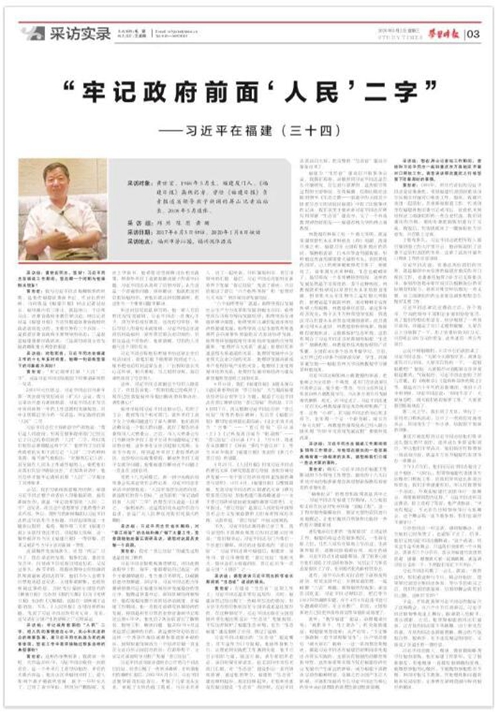 采訪對象:黃世宏,1948年5月生,福建廈門人。《福建日報》高級記者。曾任《福建日報》負責報道省領導班子新聞的屏山記者站站長。2008年5月退休。 采 訪 組:邱 然 陳 思 黃 珊 采訪日期:2017年6月3日初訪,2020年1月6日核訪 采訪地點:福州市芳沁園,福州悅華酒店 采訪組:黃世宏同志,您好!習近平同志在福建工作期間,您在哪一個時期與他接觸比較多? 黃世宏:我與習近平同志接觸較多的時期,是他任福建省委副書記、代省長的時候。當時我是《福建日報》屏山記者站站長。福州城內有三座山,就是屏山、于山和烏山,省委省政府坐落在屏山邊。屏山記者站是《福建日報》為宣傳報道省委省政府時政活動而設立的,主要任務有三個方面:一是報道省委省政府主要領導的活動;二是報道福建重要時政活動;三是采寫涉及全省發展戰略和重大典型的報道。 采訪組:對您而言,習近平同志在福建工作的十七年多時間里,他哪一句話給您留下的印象最為深刻? 黃世宏:“牢記政府前面‘人民’二字”,這是習近平同志給我留下印象最深刻的一句話。 2000年元旦剛過,習近平同志召開新年第一次省政府黨組成員(擴大)會議,我與會采訪并進行新聞報道。習近平同志在發言中談到新的一年的工作思路和發展規劃,其中讓我銘記至今的一句話是:牢記政府前面“人民”二字。 習近平同志在主持講話中嚴肅地說:“我們是人民政府,但現在很多政府部門已經忘記了自己名稱前面的‘人民’二字,所以我們很有必要重提這兩個字。”他羅列了當前某些政府機關和干部忘記“人民”二字的種種表現,毫不客氣地指出:“對那些忘記人民,甚至騎在人民頭上作威作福的人,要把他們從我們隊伍中清除出去。”在那次講話中,他對怎樣才能牢記政府前面“人民”二字提出了具體要求。 會后,我在寫新聞報道稿的時候,深感習近平同志整個講話給人印象最深刻、最有新聞性的,就是“牢記政府前面‘人民’二字”這句話,而且這個思想貫穿了他的整個講話內容。所以,我所寫的新聞稿就以習近平同志的這句話作為主標題,內容也圍繞這一主題加以組織、提煉。稿件第二天在《福建日報》頭版刊登出來后,引起很大反響。這一稿件被評為當天《福建日報》一等好稿,后來又被評為當年全省好新聞一等獎。 這篇稿件發表沒多久,省里“兩會”召開了。我在采訪時發現,很多代表、委員在發言中,自覺或不自覺地引用這句話。又沒過多久,春節來臨,我跟省領導去給駐閩部隊和離退休老同志拜年,他們不少人也情不自禁地談起這句話。全國多家媒體,也紛紛轉載這條消息。當時發行量居全國前列的《解放日報》主辦的《報刊文摘》以及《光明日報》主辦的《文摘報》,也都在一版轉摘了這篇消息。不久,《人民日報》也用同樣的標題,發表了習近平同志的有關文章。可見,這句話在全國產生的影響之廣泛和深遠。 采訪組:牢記政府前面的“人民”二字,把人民的事情放在心中,關心和關注群眾的難事急事,是習近平同志執政為民的具體體現。您在工作中是否接觸過很多這樣的典型事例? 黃世宏:這樣的事例很多,我就講一件吧。大約是2000年,習近平同志收到一封匿名信,是一個外來打工者寫給他的。來信的大致內容是:他從山區來福州市打工,愛人和兩個孩子隨著來省城。孩子一年年長大了,已到了讀書年齡,但因為戶籍限制,無法上學讀書。他希望省里能夠出臺相關政策,幫助外來打工者就地解決孩子的讀書問題。習近平同志認真看了信的內容,認為這是一個普遍性問題,亟待解決。他就把這封信批給福州市,請他們就這封信做調研,把這作為一個重要問題來解決。 但這封信究竟是誰寫的,他一家人目前的狀況究竟如何,習近平同志一直放心不下。因為來信沒有署名,也沒有寫單位,所以寫信人的身份未能知曉。習近平同志注意到信封是福州一家外資首飾企業印制的,信紙也是這個單位的。他就猜測,寫信的人可能與這個單位有關。 習近平同志特地吩咐秘書給這家企業打電話問問,看他們能不能幫助找到這個人。秘書把電話打到這家企業,廠長得知省長關心這件事,相當重視,馬上組織尋找,最后果然找到了寫信的人。 這樣,習近平同志就跟這個寫信人聯系上了,并且告訴他:“你的信我已經收到了,現在已經敦促福州市提出解決的具體辦法,請你放心!” 福州市接到習近平同志指示后,組織了工會、教育等幾個相關部門,就外來打工者子女上學難問題進行了深入調研。他們看到這確實是一個很大的問題,就打了報告給市委和市人大常委會。之后,市人大常委會專門為解決外來打工者子女讀書問題制定了相應的法規。這件事在全省引起很大反響,全省不少地方,特別是外來打工者較多的縣區,也紛紛出臺政策措施,解決外來打工者子女就學問題,促使福建在解決這個問題上一直走在全國前列。 黨的十八大閉幕后,新一屆中央政治局常委會見采訪黨代會的記者。習近平同志在講話中深情地說:“人民對美好生活的向往,就是我們的奮斗目標。”這句話和“牢記政府前面‘人民’二字”的理念可以說是一以貫之、一脈相承的。這是我們黨永遠的信念與追求,也是廣大人民群眾對我們黨最大的期盼。 采訪組:習近平同志任省長期間,對“晉江經驗”的總結和推廣做了大量工作。您曾跟隨他赴晉江調研采訪,請您對這段歷史做一個回顧。 