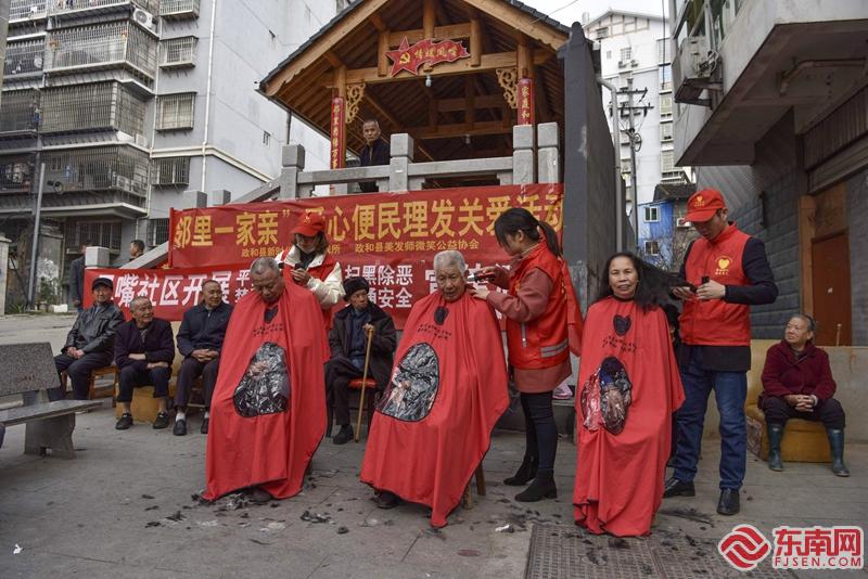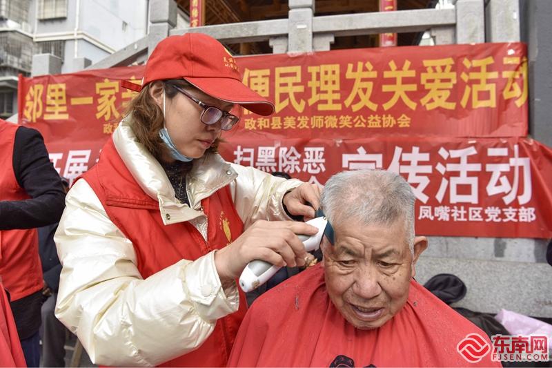 3月3日上午,政和縣美發師微笑公益協會成員聯合鳳嘴社區黨員志愿者,在義務為老年人朋友理發。 余長青/攝