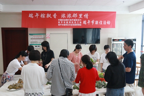 活動現(xiàn)場 姜婷 攝 為了弘揚中華傳統(tǒng)文化,培育文明風(fēng)尚,增進各單位鄰里關(guān)系,近日,農(nóng)行南平建陽支行與南平市建陽區(qū)總工會、南平市建陽區(qū)農(nóng)業(yè)機械管理站開展以“端午粽飄香 濃濃鄰里情”為主題的端午聯(lián)誼活動。相聚在農(nóng)行職工食堂,三家單位職工圍成一圈,手法嫻熟的帶著新手入門,抄起一勺晶瑩的糯米,或入咸蛋、或入豆沙、或入香肉,粽葉一卷一捏,繩子一繞,一個個三角粽子脫穎而出,現(xiàn)場洋溢著歡快的笑聲。通過本次聯(lián)誼活動,各單位職工歡聚一堂,在體驗傳統(tǒng)手藝的過程中相互交流溝通,一同感受傳統(tǒng)文化的魅力和節(jié)日的氣息,讓大家感受到了別樣的溫暖和濃濃鄰里情誼。(毛德清) |