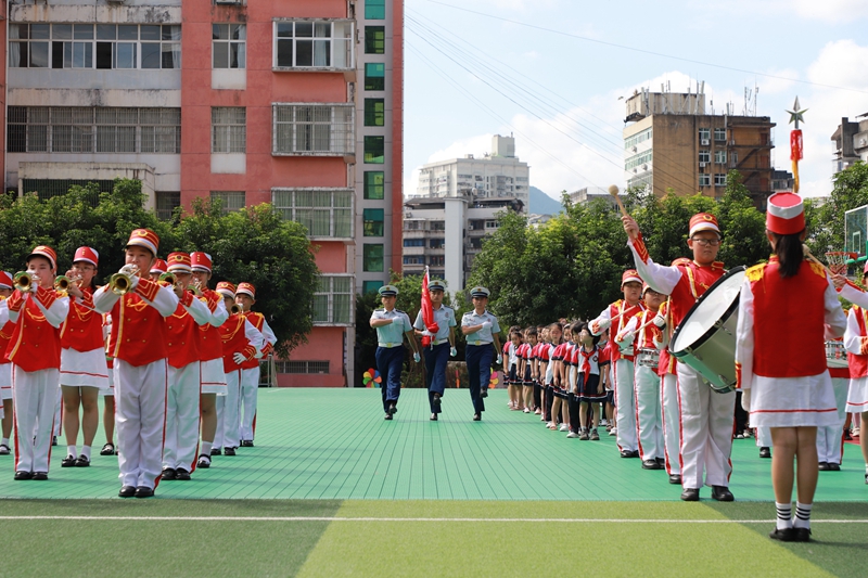 消防指戰員出旗 鄧忠華 攝 時光恰好,初秋相見。9月1日上午9點,南平實驗小學文體校區在操場上舉行了文明創建啟動儀式暨新學期開學典禮活動。隨著國歌響起,禮樂隊奏響樂曲,消防指戰員為大家出旗,五星紅旗隨風飄揚,在莊嚴的升旗儀式后,隆重而富有教育意義的開學典禮拉開了序幕。 校長林勇為新學期致辭,提出新期待:繃緊弦,防疫請,開好頭,起好步,改陋習,勤鉆研,健身心,提素養,講文明,懂禮儀,顯個性,展風采。讓我們在創建國家級文明校園的道路上策馬揚鞭,與時俱進,開拓創新,以飽滿的熱情迎接新的挑戰,為我們美好的實小而奮斗。
