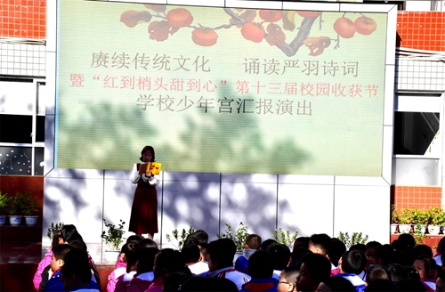 邵武市東關小學“紅到梢頭甜到心”第十三屆校園收獲節隆重開幕 該校教師帶領學生們一起誦讀嚴羽詩詞,并介紹了嚴羽的生平。隨后,同學們帶著敬佩和贊美穿越時空,走近嚴羽,誦讀經典,去感受嚴羽詩詞的魅力。低年級的《西陵望》《聞笛》,中年級的《秋日》《江行》,高年級的《訪益上人蘭若》《臨川逢鄭遐之之云夢》,以及情景劇朗誦《假如只剩下一天的時間》,特別是六(1)班的《滿江紅·送廖叔仁赴闕》,伴隨著或輕快、或激昂、或深沉的朗誦把活動推向高潮。