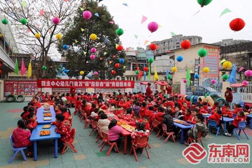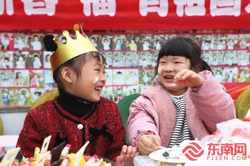 共慶生日 周文倩 攝 東南網1月11日訊(本網通訊員 周文倩 何周超) 1月7日下午,浦城縣民主中心幼兒園舉行了一場集體生日會和送“福”氣活動。 活動現場,老師和孩子們身穿紅衣歡聚在一起,以“福”字隊列,給大家送福氣。與此同時,還同享生日祝福與美味蛋糕,歡歌笑語充滿了整個現場。“很開心能和小伙伴們一起過生日,一起吃好吃點心、水果和甜美的蛋糕。”民主中心幼兒園學生金兮雯說。