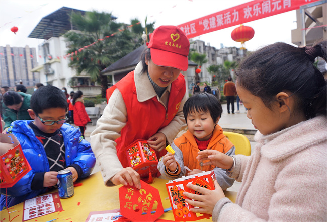 志愿者指導小朋友制作花燈。(廖晨星 洪志明 攝) 延平 14日,延平區四鶴街道新建社區聯合轄區共建單位開展“黨建聚活力 歡樂鬧元宵”主題活動,猜燈謎、做花燈、吃湯圓等環節,讓現場洋溢著祥和、喜慶的氣氛。圖為志愿者指導小朋友制作花燈。(廖晨星 洪志明 攝)