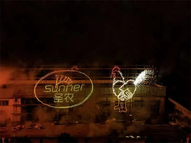 圖為無人機組成圣農品牌LOGO。 (陳志鴻 攝) 光澤 火樹銀花不夜天,銀月映庭賀華年。15日晚,圣農集團舉行無人機焰火表演,500架無人機在夜空中變幻出各種造型,隨后多層次煙花燃放,點亮了夜空。 |