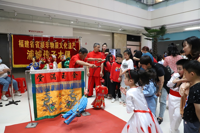 傳子木偶 浦城縣融媒體中心供圖 2022年6月11日是全國第17個“文化和自然遺產(chǎn)日”,為進一步提高人民群眾對文化和自然遺產(chǎn)的保護意識,營造非遺和文物保護濃厚的社會氛圍,傳承和弘揚中華優(yōu)秀傳統(tǒng)文化,浦城縣舉辦了“連接現(xiàn)代生活 綻放迷人光彩”等系列非遺宣傳展示活動。 在浦城永輝大廈中庭,現(xiàn)場有“文化進萬家 ‘福’見浦城”文藝演出、“福佑中華”浦城剪紙和提線木偶展演、“古城遺風(fēng)”浦城非遺圖片展、“時代共進 人民共享”浦城縣文保單位展、“直指武夷山下”南平市百年百幅革命舊址圖片展等多項內(nèi)容,吸引著市民前往觀看和體驗。“文化進萬家 ‘福’見浦城”文藝演出以快板、誦讀、舞蹈等形式展示了非遺文化的魅力;市民和孩子們紛紛拿起剪刀體驗剪紙藝術(shù)的魅力,感受操縱傳子木偶的樂趣。