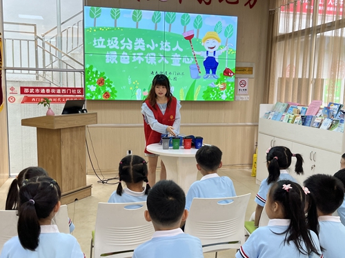 志愿者向孩子們介紹四色垃圾桶 垃圾分類(lèi)是一種健康的生活理念,更是一種美德。為進(jìn)一步宣傳垃圾分類(lèi)知識(shí),樹(shù)立綠色低碳、環(huán)保健康的生活理念,近日,邵武通泰街道西門(mén)社區(qū)聯(lián)合城裕幼兒園在社區(qū)開(kāi)展“垃圾分類(lèi)小達(dá)人,綠色環(huán)保入童心”志愿服務(wù)活動(dòng)。 “也許我們無(wú)法阻止垃圾的產(chǎn)生,但是我們卻可以減少垃圾給我們的環(huán)境和生活帶來(lái)危害,而實(shí)行垃圾分類(lèi)回收和處理就可以化害為利變廢為寶。”活動(dòng)中,志愿者圍繞“垃圾分類(lèi)的標(biāo)志”“如何進(jìn)行垃圾分類(lèi)”“垃圾處理的現(xiàn)狀”和“生活中的垃圾分類(lèi)”等方面,通過(guò)播放科普視頻和PPT,詳細(xì)講解了四色垃圾分類(lèi)法、四色垃圾的正確投放以及垃圾袋的使用等垃圾分類(lèi)基本知識(shí)。并通過(guò)與孩子們互動(dòng)問(wèn)答的形式,幫助大家初步了解垃圾分類(lèi)知識(shí)。孩子們積極踴躍地舉手回答問(wèn)題,現(xiàn)場(chǎng)氣氛十分活躍。 通過(guò)此次活動(dòng)的開(kāi)展,讓垃圾分類(lèi)理念和意識(shí)深入孩子們的心,通過(guò)小手牽大手的方式起到一個(gè)孩子帶動(dòng)一個(gè)家庭,吸引每個(gè)家庭參與并支持垃圾分類(lèi)工作,逐步養(yǎng)成低碳環(huán)保的生活方式,營(yíng)造綠色宜居的人文環(huán)境。(通泰街道西門(mén)社區(qū) 圖/林彤 文/肖娟) |