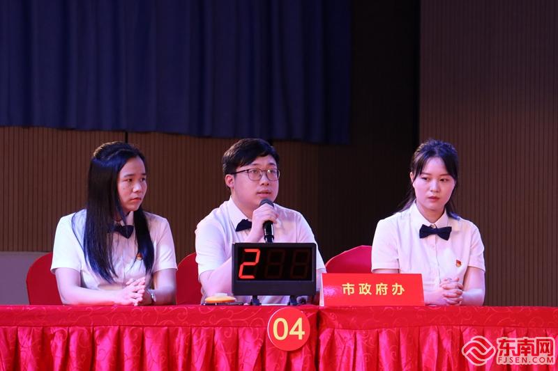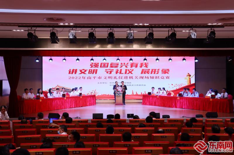 南平市舉辦“講文明、守禮儀、展形象”文明禮儀進機關現場知識競賽 東南網記者 鄭正華 攝 東南網6月28日訊(本網記者 鄭正華)為助力“喜迎二十大、辦好省運會、爭創(chuàng)文明城、展示新形象”工作,充分發(fā)揮市直機關廣大黨員干部的先鋒模范作用,走前頭、作表率,帶動提升市民文明素質和社會文明程度,6月27日晚,中共南平市委文明辦、市直機關工委聯(lián)合舉辦“講文明、守禮儀、展形象”文明禮儀進機關現場知識競賽。 南平市委常委、宣傳部部長劉用通,市人大常委會副主任潘敏芳,市政協(xié)副主席余建坤,市直機關工委常務副書記嚴軍,市委宣傳部部務會成員、文明辦主任黃益水,市總工會、團市委、市婦聯(lián)及各黨建片參賽隊單位領導和觀賽代表出席觀摩比賽。