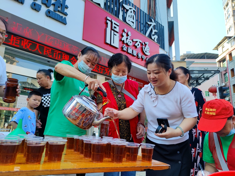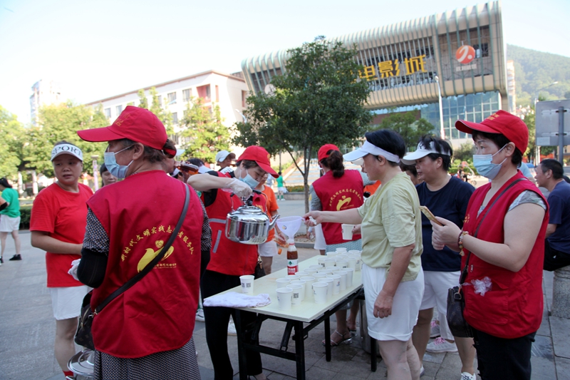 圖為7月24日,政和縣老年志愿者協會志愿者在市民廣場為晨練群眾送涼茶。王翠珠 攝 “喝上一杯溫度剛剛好的涼茶,既解暑又解渴,讓我一天都元氣滿滿。”7月25日7時,政和縣林茂路口,林女士喝著縣老年志愿者協會志愿者遞來的涼茶,高興地說。 一張小方桌,幾個涼茶桶,幾百個一次性杯子,就是政和縣老年志愿者協會涼茶攤的全部配置。自2005年以來,政和縣老年志愿者協會開展義務送涼茶活動已有17年。盛夏街頭,年復一年,一位又一位老年志愿者們用不變的熱情,交替接力,支起了一個個涼茶攤,也為過往市民送去了盛夏中的一抹清涼。 說到送涼茶的歷史,就不得不提一個重要的人——楊浩明。2006年11月,楊浩明剛剛退休,“閑不住”的他立即投入到志愿服務工作當中。憑借他樂善好施,不計名利的品格,很快就帶動起了一批志愿者隊伍,并倡導成立了政和縣老年志愿者協會,持續開展“美麗政和 從我做起”系列活動。 “當時,就是想盡己所能為大家做一點貢獻。因為自己原先經常喝中藥,對涼茶熬制有一些經驗。就組織大家每年夏天上山采草藥熬制涼茶?!闭涂h老年志愿者協會原會長楊浩明說,每年在泡涼茶的過程中都得到了許多市民支持,他們捐柴火、草藥、白糖、錢、杯子等物資。 涼茶熬制的原料包括魚腥草、夏枯草、金銀花等37種中草藥,草藥的搭配通過咨詢專業的醫務人員,具備消暑等功效。過去,熬制一鍋涼茶需要近1小時。從晚上12點開始,到早晨6點,老年志愿者們每晚都要熬制10桶左右的涼茶。1個小時后,涼茶就會被運往城區7個新時代文明實踐免費涼茶服務點免費供市民飲用。