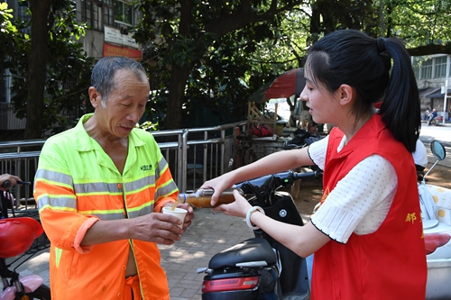 志愿者們?yōu)橐痪€職工和過(guò)往的行人送上一杯解暑的擂茶。邱雯禎 攝 近日,全國(guó)持續(xù)高溫,酷暑難耐。連日來(lái),光澤縣杭川鎮(zhèn)組織十余名志愿者開(kāi)展防暑降溫送清涼活動(dòng),為從事道路交通、公安、環(huán)衛(wèi)綠化、快遞物流、外賣配送等露天和高溫作業(yè)場(chǎng)所的一線職工送上一杯杯清涼解暑的擂茶。 志愿者們向社區(qū)大媽學(xué)制擂茶,從下午四點(diǎn)至六點(diǎn)為一線職工、過(guò)往的行人送上一杯解暑的擂茶,受到了大家的熱烈歡迎。環(huán)衛(wèi)工人陳先生表示:“這么熱的天氣,感謝志愿者給我們送來(lái)爽口又解暑的擂茶。” 據(jù)悉,擂茶是光澤縣當(dāng)?shù)刈畛R?jiàn)的待客之道,幾乎家家戶戶都會(huì)自制擂茶。它茶味濃厚、香氣撲鼻,有生津止渴、清涼解暑的功效。為了讓高溫作業(yè)下的一線職工喝上地道的擂茶,光澤縣杭川鎮(zhèn)梅樹(shù)灣社區(qū)請(qǐng)到了77歲的陳愛(ài)香老人教授志愿者們制作擂茶的技藝。志愿者們表示將制作更多的擂茶,常態(tài)化開(kāi)展夏日送清涼活動(dòng),為轄區(qū)內(nèi)更多有需要的群體送上關(guān)心與愛(ài)護(hù)。(陳協(xié)明 郭惠) |