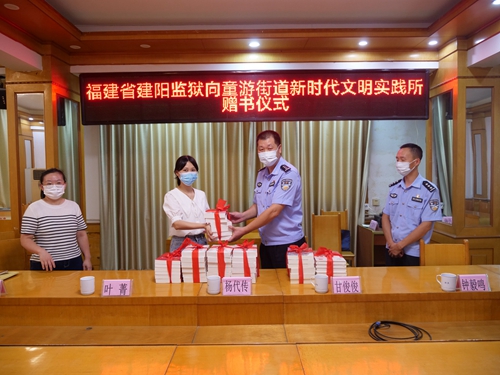 建陽(yáng)監(jiān)獄向童游街道新時(shí)代文明實(shí)踐所捐贈(zèng)書(shū)籍 朱麗君 攝 宣講活動(dòng)后,福建省建陽(yáng)監(jiān)獄向童游街道新時(shí)代文明實(shí)踐所捐贈(zèng)了《中國(guó)共產(chǎn)黨歷史》《習(xí)近平談治國(guó)理政》第四卷等書(shū)籍,為社區(qū)文化建設(shè)添磚加瓦,營(yíng)造全面學(xué)習(xí)習(xí)近平新時(shí)代中國(guó)特色社會(huì)主義思想的良好氛圍。(南平市建陽(yáng)區(qū)委文明辦供稿 朱麗君) |