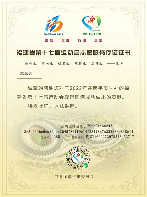 福建省第十七屆運動會志愿服務存證證書樣本 南平團市委供圖 |
