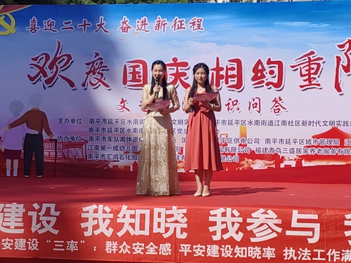 9月29日,延平區供電公司和轄區社區聯合開展文藝匯演。林琳 攝 金秋時節,丹桂飄香。在國慶、重陽即將到來之際,為豐富轄區居民群眾的精神文化生活,充分展現轄區黨員群眾精神風貌,謳歌黨的光輝歷程和社會主義各項建設事業所取得的巨大成就,同時為轄區老人送上節日祝福,南平市延平區水南街道江南社區聯合國網延平區供電公司及轄區單位,以“喜迎二十大、奮進新征程”為主題,組織開展“歡度國慶,相約重陽”文藝匯演活動。 此次文藝演出內容豐富多彩,活動在“好婆婆、好媽媽和好鄰居”表彰活動后開場,緊接著幼兒園小朋友舞蹈《祖國祖國我愛你》《中國么么噠》《燈火里中國》《兵娃娃》相繼演繹,延平區供電公司選送的女高音獨唱《報答》將整場活動推向高潮。在文藝演出過程中穿插進行了黨史黨建知識問答,轄區居民踴躍參與搶答,答對者都能得到一份精美小禮品,現場氣氛踴躍熱烈。 通過本次活動,弘揚了尊老敬老、愛老助老的優良傳統,增強了公司與轄區居民的凝聚力和向心力,營造了熱烈喜慶的節日氛圍。(林琳) |