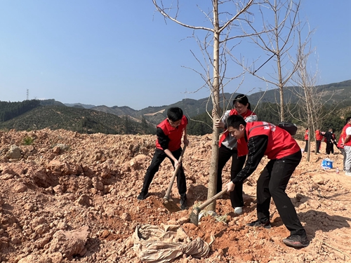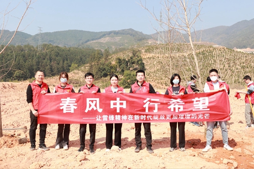 志愿者們三五人一組進行植樹 春風吹拂,萬物復蘇,為深入貫徹黨的二十大精神,促進人與自然和諧共生,3月9日上午,在中國第45個植樹節來臨之際,中國銀行南平分行團委組織青年志愿者在延平區夏道鎮開展“春風中 行希望”主題植樹節活動,用實際行動弘揚雷鋒精神,踐行“綠水青山就是金山銀山”的理念。 活動現場,志愿者們三五人一組,分工明確、相互配合,從扶直苗木、揮鍬鏟土到填坑定植、提水澆灌,每個步驟都扎實有序,現場一片朝氣蓬勃的景象,經過一個上午的緊張忙碌,一棵棵新栽樹木迎風佇立,萌發出盎然生機。