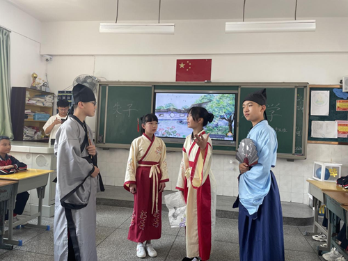 南平市朱子文化講壇負責人伊劍平受邀來到南平實小,給孩子們講述朱熹的生平經歷。南平實驗小學供圖 “演·朱子”——穿越時空看朱子 品“源頭活水”,看“姹紫嫣紅”。四月,南平實驗小學在四所校區共同開展以“弘揚朱子文化,書香潤澤童心”為主題的讀書節活動,以孩子們喜聞樂見的形式,將朱子文化融入孩子的學習生活之中,引領孩子們感受朱子文化魅力。 南平實小文體校區六年級(5)班的孩子們,自主討論將朱子求學的經歷改編成課本劇,拿到了今年讀書節的一等獎。故事講的是朱熹、陸九齡和陸九淵在鵝湖寺展開的理學、心學之辯,史稱“鵝湖之會”。