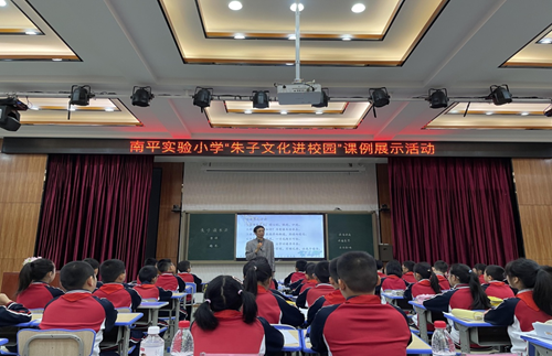 朱子繪畫展,小小解說員為觀眾解說自己的創作心得。南平實驗小學供圖 “浸·朱子”——品悟朱子讀書法 “凡讀書,須要讀得字字響亮,不可誤一字,不可少一字,不可多一字,不可倒一字......”4月27日上午,南平實驗小學文體校區報告廳書聲朗朗。四年級(8)班的孩子們使用《朱子文化小學讀本》,學習《童蒙須知》里的《朱子讀書法》。孩子們在課堂中學習“讀準讀通、讀懂意思、讀出韻味”的法則,品悟朱子讀書之法。 課上,南平市朱子文化講壇的負責人伊劍平受邀分享朱熹的讀書之道,深入淺出宣傳推廣朱子文化,拉近了孩子們與大儒朱熹的時空距離。