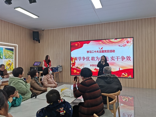 水北街道水東社區開展專題主題黨課活動 以“學”當先,在深學細悟中激發奮進力量 以“集中+自主”的形式引導全體街居干部進行學習,不斷學深悟透黨的二十大精神,“線上”通過微信公眾號等平臺作為“指尖課堂”,及時推送學習黨的二十大精神、系列解讀、亮點金句等內容。“線下”通過開展一次集中學習、一堂專題黨課、策劃一輪主題宣傳、進行一次思想交流,原滋原味學習黨的二十大報告和黨章,將黨的二十大精神作為干部提升綜合能力的“加油站”,形成“人人想學、全員參學”的良好氛圍。截至目前,全街共開展交流研討、主題黨日、主題黨課等活動58次,撰寫學習心得260余篇。推動黨的二十大精神深入人心。 以“宣”為導,在潛移默化中營造濃厚氛圍 依托街道新時代文明實踐站、所,廣泛動員志愿宣講隊伍,以“文藝匯演+紅色基地觀摩+走訪入戶+書記講黨課+小板凳課堂”等接地氣的方式開展宣講,將“被動式宣講”變為“互動式交流”,在企業單位、田間地頭、小區廣場內開展形式多樣的宣講活動,用生動的“土話”講鮮活的故事,讓居民聽得懂、記得住。截至目前,全街共開展文藝匯演8次,入戶宣講460余次,書記講黨課等活動32次,推動黨的二十大精神學習宣傳向基層“最后一公里”延伸。