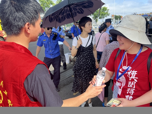 志愿者發(fā)放礦泉水 你在考場拼搏,我在場外守護。2023年高考如期而至,建陽監(jiān)獄四監(jiān)區(qū)黨支部開展“愿你今朝六月 不負十載年華”高考志愿者服務(wù)活動,為考生加油助力。 暖心服務(wù),提供所需。6月7日一大早,民警志愿者就在南平市建陽區(qū)第二中學(xué)考場外待命。志愿者們聯(lián)合現(xiàn)場老師、配合交警同志進行文明勸導(dǎo)、秩序維護,提醒送考家長遵守秩序、嚴禁喧嘩,在交通路口、人行橫道維護交通,拉起警戒線,整理停放不規(guī)范的電動自行車,為考生們安心考試營造一個安靜有序的外圍環(huán)境。