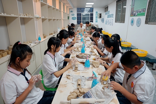 陳雪芳和愛人李天保正在授課 浦城縣融媒體中心供圖 “大口窯青白瓷具有薄如紙、青如天、明如鏡、聲如磬的特征,捏的時候要注意泥坯的厚薄、軟硬、干濕……”在浦城縣第三中學一樓的大口窯青白瓷社團課教室里,市級非遺傳承人陳雪芳和她的愛人李天保,一邊細致講解,一邊指導同學們捏坯塑形。 伴隨著宋元時期“海上絲綢之路”的繁華,大口窯的精美瓷器經由南浦溪流入閩江,后從福州港、泉州港出海,遠銷日本、東南亞、歐洲等地,蜚聲國際。2022年,“浦城縣大口窯青白瓷制作技藝”被列入福建省第七批省級非物質文化遺產代表性項目名錄。 “捏泥坯、塑造型的過程特別解壓,我體驗到了初學陶藝的樂趣。”七年級(3)班的唐尹墨同學說,他小時候就喜歡玩泥巴,沒想到中學還有這么有趣的課程,以后不管是在學習還是在生活中,他都要以“匠人精神”來要求自己。 “這是老祖宗給我們留下的珍貴文化,當一塊泥坯在我們的手中變幻出各種造型,我覺得很有成就感。”八年級(3)班的孟燾然同學說,她從七年級開始選學大口窯青白瓷社團課,當她看見一件件精美的瓷器,了解到其中精巧的技藝,對瓷文化產生了濃厚的興趣。 走出大口窯青白瓷社團課的教室,走上二樓教室,一陣陣悠揚的琴聲隨風飄揚,省級非遺項目“浦城閩派古琴”省級傳承人吳燕琳,正在耐心地指導學生古琴彈奏的指法技巧。“閩派古琴具有很高的學術價值,值得孩子們去探索,他們都在很認真地練習。”吳燕琳說,如今她在傳授閩派古琴技藝的同時,也在不斷研究學習,希望古琴聲能在一代代人接續努力下響徹閩北大地。