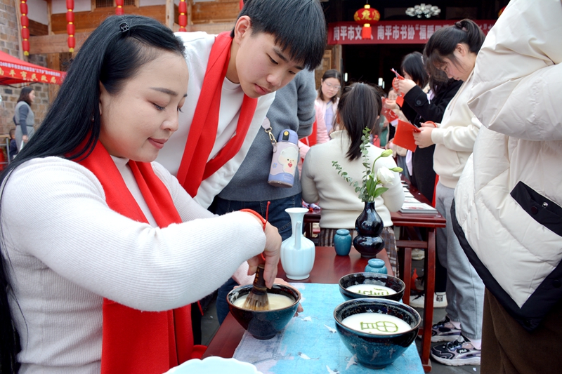 展示點茶文化 光澤縣委宣傳部供圖 活動現場,架子鼓合奏《鼓舞中國、恭喜發財》、群舞《小城謠》、小品《橙子熟了》等特色節目表演,引得現場觀眾陣陣叫好。臺上歡歌載舞,臺下其樂融融。各有關單位開展科技咨詢、農技服務、醫療義診、法律咨詢等志愿服務活動。來自市書協的書法愛好者們揮毫潑墨,將一副副年味濃濃的春聯、一張張寓意祥瑞的“福”字送給現場群眾。