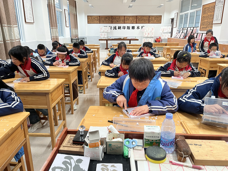 學生在練習建本雕刻工藝。南平市委文明辦供圖 “半畝方塘一鑒開,天光云影共徘徊。”“勝日尋芳泗水濱,無邊光景一時新。”……行走在校園,隨處可見的是學生的建本作品,非遺文化的浸潤,讓書香校園的氣息愈發濃郁。“我們在學校文化長廊中開辟‘建本風采’板塊,由專人定期更新。還在每間教室設立建本作品展示區,張掛學生優秀作品,供同學們欣賞交流。”麻沙中心小學校長彭寶平介紹道。 除了一月一次的作品展示外,學校還充分利用每個節假日的教育展示時機,讓每個孩子接觸雕版和臨帖,并獲得成功的體驗。在六一兒童節、校園文化藝術節定期開展主題建本作品展;在九九重陽節,孩子們將建本作品送給軍烈家屬、孤寡老人帶去慰問;在春節期間,走上街頭,為廣大麻沙人民送去祝福。建本,這古老的非遺技藝,在學生的手中刻畫成了最深刻的家鄉記憶。