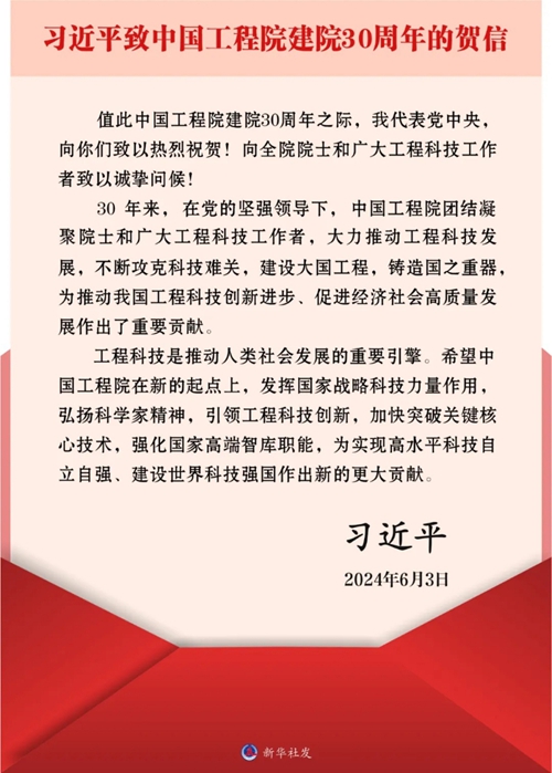 視頻來源:中央廣播電視總臺 習近平致信祝賀中國工程院建院30周年強調 發揮國家戰略科技力量作用 為實現高水平科技自立自強建設世界科技強國作出新的更大貢獻 丁薛祥出席院士座談會并講話 新華社北京6月3日電 在中國工程院建院30周年之際,中共中央總書記、國家主席、中央軍委主席習近平發來賀信,代表黨中央致以熱烈祝賀,向全院院士和廣大工程科技工作者致以誠摯問候。 習近平在賀信中指出,30年來,在黨的堅強領導下,中國工程院團結凝聚院士和廣大工程科技工作者,大力推動工程科技發展,不斷攻克科技難關,建設大國工程,鑄造國之重器,為推動我國工程科技創新進步、促進經濟社會高質量發展作出了重要貢獻。 習近平強調,工程科技是推動人類社會發展的重要引擎。希望中國工程院在新的起點上,發揮國家戰略科技力量作用,弘揚科學家精神,引領工程科技創新,加快突破關鍵核心技術,強化國家高端智庫職能,為實現高水平科技自立自強、建設世界科技強國作出新的更大貢獻。 3日上午,中國工程院在京舉行“踐行工程科技使命 推進科技強國建設”院士座談會。中共中央政治局常委、國務院副總理丁薛祥出席會議,宣讀習近平賀信并講話。 丁薛祥在講話中指出,中國工程院成立30年來,堅決貫徹黨中央和國務院決策部署,大力推動工程科技發展,匯聚一流創新人才、產出一流科技成果、貢獻一流咨詢建議、打造一流學術平臺,在國家發展進步中發揮了重要作用。 丁薛祥強調,在新時代新征程上,中國工程院要牢記建院初心、傳承光榮傳統,在學習貫徹習近平總書記重要指示精神、為高水平科技自立自強而奮斗的進程中爭當排頭兵。要當國家戰略科技力量的排頭兵,牢牢把握新一輪科技革命和產業變革的戰略機遇,奮力搶占科技制高點。要當工程科技創新的排頭兵,解決好重大工程科技問題,推進科技創新成果產業化應用,更好服務新質生產力發展。要當突破關鍵核心技術的排頭兵,從國家急迫需要和長遠需求出發,加強“卡脖子”技術攻關,力爭在重要領域取得更多原創性突破。要當國家高端智庫建設的排頭兵,緊緊圍繞具有戰略性方向性全局性的重大問題,加強前瞻性、針對性、儲備性戰略研究,支撐黨和國家決策。丁薛祥希望廣大工程院院士帶頭大力弘揚科學家精神,把人生理想融入國家和民族的事業中,深懷愛國之心、秉持報國之志、勇攀科技高峰,不負黨和人民的殷切期望。 座談會上,中國工程院負責人和院士代表作了發言。 中國工程院成立于1994年6月3日。30年來,中國工程院牢記中國工程科技界最高學術機構職責使命,聚力科技創新、匯聚領軍人才、建設高端智庫、堅持學術引領,取得了一系列重大成果。 |