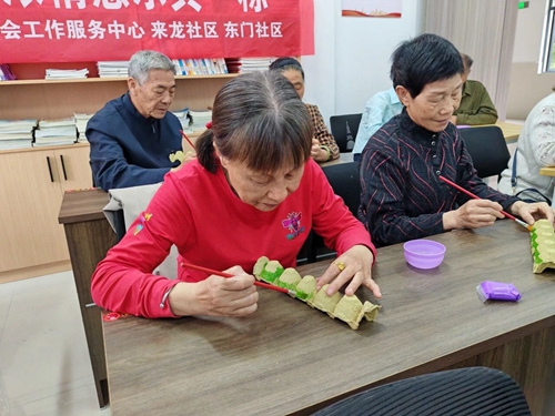 老人們正在認真畫龍舟 李夢凌 攝 “原來蛋托也能做出這么好看的‘龍舟’,一會孩子放學后,我將把這份禮物送給他們。”來龍社區楊阿姨高興地舉著手中的“龍舟”說道。在繪畫的過程中,老人們相互幫助,分享彼此的繪畫技巧和心得,現場充滿歡聲笑語。 當天,還為老人們送上充滿濃濃情意的粽子,并提前祝福他們節日快樂,此次活動得到社區居民的廣泛好評,這樣的活動在豐富老年人的精神文化生活的同時,也傳承了中華優秀傳統文化。(李夢凌) |