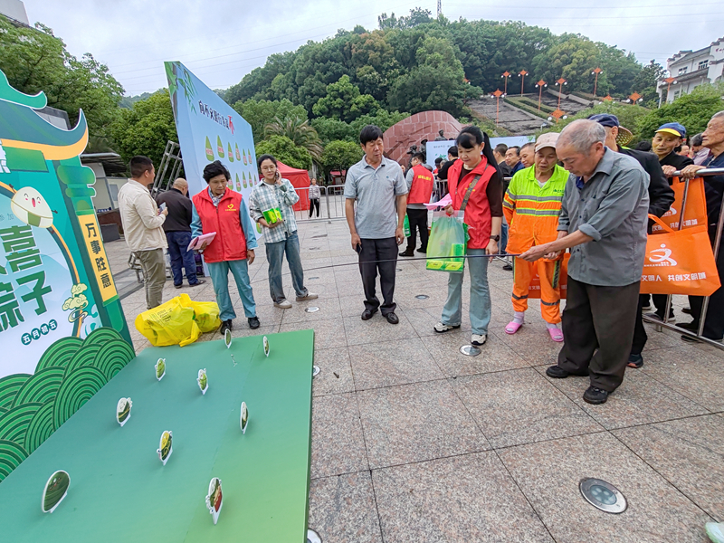 釣粽子知識問答 中共浦城縣委文明辦供圖 活動現場,粽葉飄香,志愿者和現場群眾相互配合、巧手翻飛,不一會兒就包好了一個個新鮮的大肉粽。包好愛心粽子煮熟后送往商業城志愿服務驛站,發放給環衛工人。“向不文明行為說不”由端午傳統習俗“射五毒”演化而來,參與活動的群眾說出自己認為最不文明的三種行為并用箭射中,潛移默化中引導群眾對不文明行為說不的自覺意識。趣味釣粽子則是在每一個卡通粽子上加上創城應知應會知識問答,讓群眾在游戲中了解和掌握浦城縣創建文明縣城相關知識。