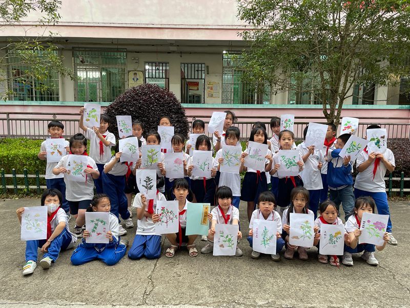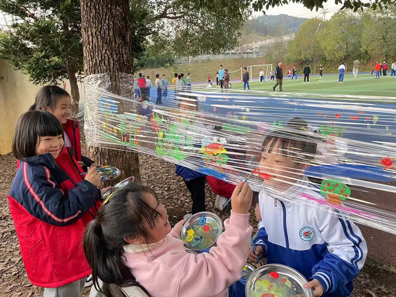 《戶外涂鴉》課 南平市委文辦供圖 春日時節(jié),將一卷保鮮膜纏繞在兩棵樹間,一張長長透明的畫布就鋪在了“小畫家們”面前。你畫一個太陽,我畫一道彩虹,他再添上幾棵小樹,一堂獨(dú)特的《戶外涂鴉》課讓孩子們感到新奇又快樂。 陽光正好的時候,老師會帶著孩子們到戶外上《陽光剪影》課,讓孩子們以陽光為筆,草木為墨,尋找一幅幅美麗的風(fēng)景畫。而在《樹葉拓畫》課上,老師會讓孩子們挑選采摘自己喜歡的樹葉,并在想象力的加持下,創(chuàng)作出一幅幅獨(dú)特的藝術(shù)作品。“每周最開心的就是畫畫、做手工!”二年級的陳年昊同學(xué)如是說。