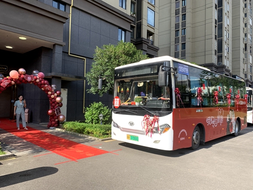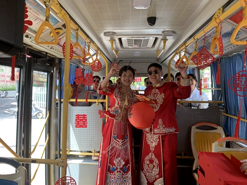 “公交婚車” 建甌公交公司供圖 6月24日清晨,陽光柔和地灑在建甌的街頭,兩輛新潮且奪目的新能源純電動(dòng)公交車悄然駛?cè)胧忻竦囊曇啊K鼈儾辉偈侨粘Mㄇ诘慕煌üぞ撸潜痪难b扮成低碳環(huán)保且洋溢著浪漫氣息的“幸福婚車”。車頭上,紅花簇?fù)恚笳髦榕c喜悅;車窗上,“囍”字熠熠生輝,傳遞著滿滿的幸福與祝福;車廂內(nèi)一片溫馨浪漫的景象,宛如一座流動(dòng)的婚禮殿堂。 “選擇公交車作為婚車,是我們兩家人認(rèn)真商量后決定的,因?yàn)槲覀儍杉易〉靡脖容^近,公交車也低碳環(huán)保,建甌這邊我們應(yīng)該算是第一對(duì),創(chuàng)新又時(shí)尚,親朋好友一起乘坐,也更溫馨又浪漫。”新郎王子游說道。 這對(duì)“90后”新人選擇了一種別出心裁的迎親方式,親朋好友共同搭乘,記錄下這美好而難忘的時(shí)刻。歡聲笑語,祝福聲此起彼伏,“公交婚車”使這短暫的接親之旅變成了親朋好友共同見證新人浪漫與幸福的珍貴時(shí)刻。他們用獨(dú)特的方式詮釋了幸福與浪漫的真諦,沒有豪華車隊(duì)的喧囂,卻多了一份清新與雅致。他們用自己的方式表達(dá)了對(duì)愛情和生活的熱愛,傳遞出了一種積極、健康、向上的生活態(tài)度。