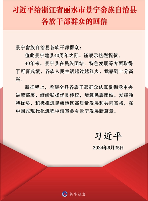 視頻來源:中央廣播電視總臺 習近平給浙江省麗水市景寧畬族自治縣各族干部群眾回信強調 弘揚優良傳統發揮獨特優勢 在中國式現代化進程中譜寫畬鄉景寧發展新篇章 新華社北京6月26日電 中共中央總書記、國家主席、中央軍委主席習近平近日給浙江省麗水市景寧畬族自治縣各族干部群眾回信,向景寧建縣40周年表示熱烈祝賀,對景寧發展提出殷切希望。 習近平在回信中說,40年來,景寧縣在民族團結、特色發展等方面取得了可喜成績,各族人民生活越過越紅火,我感到十分高興。 習近平強調,新征程上,希望全縣各族干部群眾認真貫徹黨中央決策部署,繼續弘揚優良傳統,增進民族團結,發揮獨特優勢,積極推進民族地區高質量發展和共同富裕,在中國式現代化進程中譜寫畬鄉景寧發展新篇章。