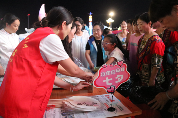 市民群眾在主題打卡板打卡拍照,武夷街道供圖 為弘揚中華民族傳統(tǒng)文化,豐富居民的精神文化生活。近日,武夷街道新時代文明實踐所聯(lián)合八角亭社區(qū)新時代文明實踐站在武夷山市海洋公園廣場舉辦“我在新時代文明實踐所過七夕”主題活動。