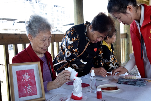 積善之家,必有余慶。10月10日上午,武夷山市新豐街道在閩北古廊橋——余慶橋開展以“孝親敬老話重陽 清正廉潔傳家風”為主題的重陽節敬老活動。新豐街道退休干部、轄區居民等50余人參加活動。 在拓印現場,志愿者詳細講解了拓印潤紙、掃紙入凹、蘸墨、上墨、揭紙等實操的注意事項,手把手地教老年人如何進行拓印,帶著老年人感受著紙張與拓版之間的微妙變化。老年人認真制作,一幅幅“清廉”“余慶”“平安”“順遂”等寓意美好的詞語被展示出來,一張張紅色拓片不僅僅是手工藝品,更是對廉潔文化、傳統文化、愛老敬老文化的傳承,進一步領略非遺技藝的魅力。
