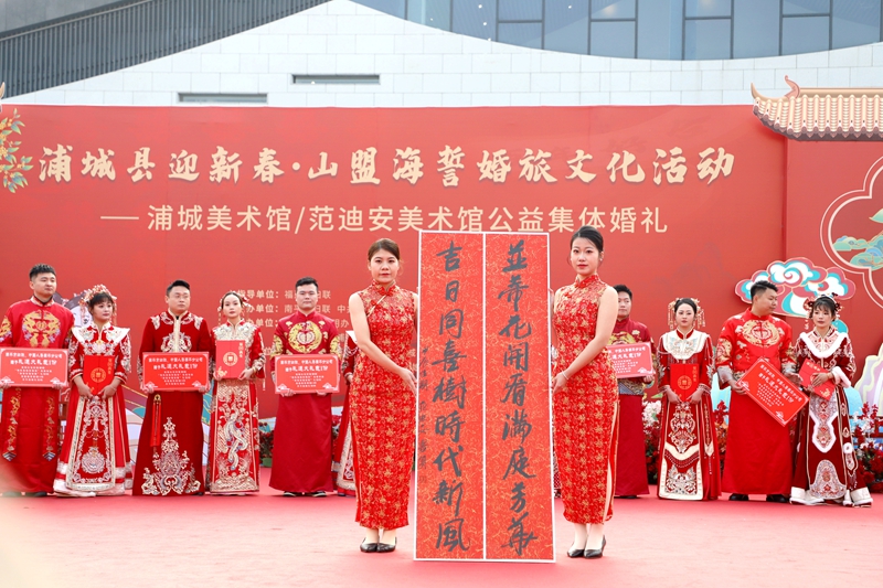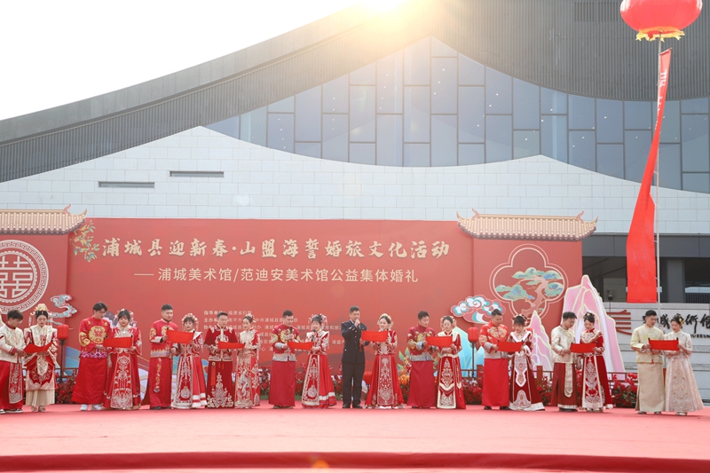 鳳冠霞帔,官方作媒。1月15日,一場文明又浪漫的戶外公益集體婚禮在浦城美術館/范迪安美術館舉行。南平市、浦城縣有關領導參加活動。 |