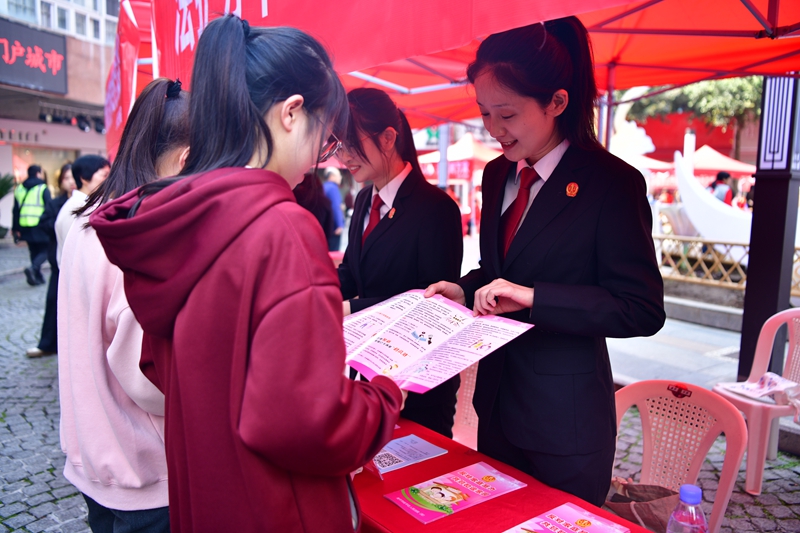 活動現場 游立成 攝 志愿者向過往群眾細致講解《中華人民共和國民法典》等法律法規、宣傳反詐知識,律師解答職工關于權益糾紛的疑問,心理咨詢師為青少年家庭支招,醫護人員教授心肺復蘇、為群眾測量血壓……一抹抹“志愿紅”成了別樣風景。