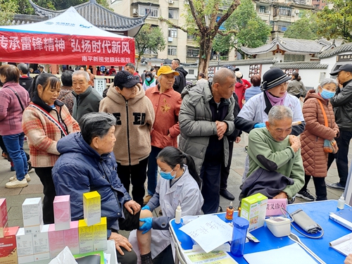 志愿者們發(fā)放宣傳單 醫(yī)療服務(wù)區(qū)同樣忙碌,眼科醫(yī)生一邊為居民檢查視力,一邊分享自己的感受:“能運(yùn)用自己的專業(yè)知識(shí)為大家做點(diǎn)實(shí)事,看到居民們滿意的笑容,覺得一切辛苦都值了。我們也希望借這個(gè)機(jī)會(huì),多向大家普及用眼的健康知識(shí),提升大家的健康意識(shí)。”他和其他醫(yī)護(hù)志愿者們耐心細(xì)致,為居民免費(fèi)開展眼科檢查、口腔檢查、量血壓、測(cè)血糖等常規(guī)項(xiàng)目,并結(jié)合居民身體狀況,給出針對(duì)性的健康咨詢與疾病防治建議,用專業(yè)知識(shí)守護(hù)居民健康。 此外,活動(dòng)現(xiàn)場還設(shè)置了多個(gè)宣傳區(qū)域,圍繞移風(fēng)易俗、禁毒、消防安全、網(wǎng)絡(luò)安全、防范電信詐騙、垃圾分類、黨建知識(shí)、廉潔文化等內(nèi)容展開宣傳。志愿者們通過發(fā)放宣傳資料、案例分享、互動(dòng)問答等形式,將實(shí)用知識(shí)與理念傳遞給居民,引導(dǎo)大家樹立文明健康的生活方式和積極向上的價(jià)值觀念。 此次學(xué)雷鋒志愿活動(dòng),不僅為居民提供了實(shí)實(shí)在在的幫助與服務(wù),更讓雷鋒精神在新時(shí)代綻放出更加耀眼的光芒,激勵(lì)著更多人投身志愿服務(wù),共同為社會(huì)發(fā)展貢獻(xiàn)力量。(游立成、洪志明 文/圖) |