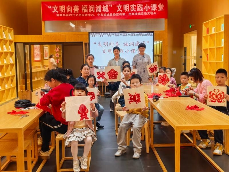 非遺剪紙 姚華芳 攝 據悉,為進一步發揮浦城縣新時代文明實踐中心學文化主陣地的作用,讓浦城優秀傳統文化浸潤孩子心靈,浦城縣抓住五一節假契機舉辦了“我在新時代文明實踐中心過五一”非遺體驗系列活動,每天開設“剪紙、青白瓷、木偶戲、閩派古琴”等四大類浦城本土非遺體驗活動,共計20余場次。
