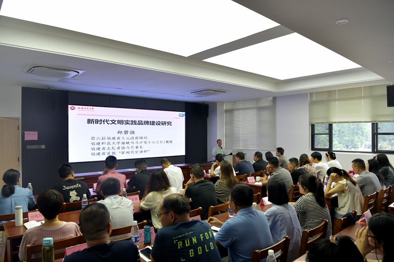 各實(shí)踐所代表坐在一起交流 游立成 攝 專(zhuān)家講授 提升做好文明實(shí)踐工作能力 福建師范大學(xué)海峽社會(huì)研究中心主任、文化旅游與公共管理學(xué)院鄭碧強(qiáng)教授以《新時(shí)代文明實(shí)踐品牌建設(shè)研究》為題進(jìn)行了專(zhuān)題授課,結(jié)合實(shí)踐案例深度解析了文明實(shí)踐品牌建設(shè)的邏輯與成效、面臨挑戰(zhàn),從如何結(jié)合當(dāng)?shù)匚幕⑷罕娦枨蟆?chuàng)新融合角度,就打造文明實(shí)踐品牌項(xiàng)目提出了解題公式。