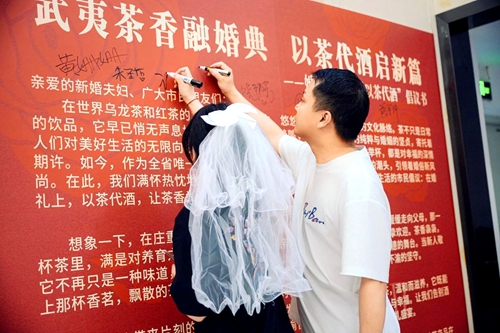 新人簽署“婚宴以茶代酒”倡議書 當“520”的甜蜜氛圍漫溢,諧音“我愛你”的浪漫密碼,讓這一天成為無數新人鐫刻幸福的良辰。今年,隨著婚姻登記“全國通辦”政策全面落地,打破戶籍藩籬,為各地婚登處帶來“甜蜜浪潮”。作為福建省唯一的全國婚俗改革實驗區,武夷山市婚姻登記中心在這場浪漫盛事中,將政策便利與文明新風深度融合。 依托“三茶統籌”發展戰略,武夷山市婚姻登記中心以茶為媒,將婚俗改革與茶文化傳承巧妙結合。提前開啟線上線下雙通道預約,精心布置登記窗口,增設打卡點,安排志愿者及專業服務團隊,確保新人享受高效便捷的登記體驗。在莊重的頒證環節,特邀頒證員見證新人宣讀《結婚誓言》,新人共同簽署“婚宴以茶代酒”倡議書,用一杯香茗許下終身承諾,踐行簡約適度、健康向上的婚俗新風。