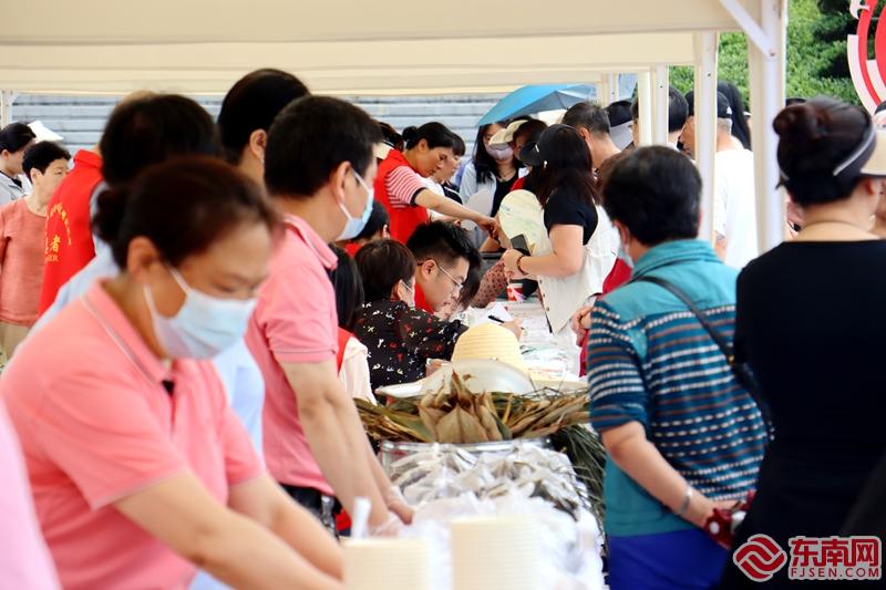 互動體驗區,現場人頭攢動。東南網記者 鄭正華 攝 活動現場還設置了多個互動體驗區,現場人頭攢動,粽葉飄香。在傳統文化非遺展示區,金銀打制、武夷竹刻等傳統技藝精彩呈現,市民們不僅可以近距離觀賞匠人們的精湛手藝,還能親身體驗包粽子、打麻糍粿、縫制艾草香囊等端午特色民俗活動。特別設置的“端午文化長廊”以豐富的圖文展板,生動展現了端午節的悠久歷史淵源、屈原的愛國故事以及各地獨具特色的端午習俗,為市民們打開了一扇了解傳統文化的窗口。
