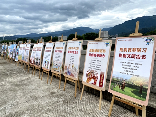 剪紙活動 非遺文化“活態(tài)傳承” 打造沉浸式體驗市集 《京劇秀》驚艷亮相將經(jīng)典故事演繹得蕩氣回腸;《魚燈秀》流光溢彩,魚燈游弋;《寶劍秀》剛?cè)岵宫F(xiàn)非遺魅力;《采茶秀》用靈動舞姿展現(xiàn)采茶場景;《木偶秀》惟妙惟肖,妙趣橫生;《儺舞秀》身著傳統(tǒng)服飾演繹著松溪的歷史故事和民間傳說;《白茶秀》在手指靈動間展現(xiàn)傳統(tǒng)制茶的神奇魅力……非遺文化市集上,松溪版畫、湛盧劍(茶刀)等手作精品的展示,見證著傳統(tǒng)工藝的當(dāng)代轉(zhuǎn)化。在部分非遺項目互動體驗區(qū),非遺傳承人帶領(lǐng)青年群體動手實踐,在勞動體驗中感受非遺魅力。 活動現(xiàn)場群眾如同穿越時空長廊,在傳統(tǒng)與現(xiàn)代的交融中,感受新時代非遺文化的蓬勃生命力和與時尚魅力。 文明新風(fēng)“成風(fēng)化俗” 移風(fēng)易俗入腦更入心 “移風(fēng)易俗”趣味猜謎活動,一條條彩印的謎語懸掛于紅線上,謎語通俗易懂、生動有趣,涉及倡導(dǎo)現(xiàn)代婚禮方式、整治陳規(guī)陋習(xí)、文明節(jié)儉過節(jié)等內(nèi)容,既貼近生活實際,又富有教育意義;圖說移風(fēng)易俗、文明新風(fēng)公益廣告漫畫展,用簡潔明快、通俗易懂的畫面和語言,闡述文明故事,弘揚文明理念;咨詢臺前講習(xí)員用方言將移風(fēng)易俗的內(nèi)容娓娓道來,內(nèi)容涵蓋反對鋪張浪費、抵制高價彩禮、提倡喜事新辦、喪事簡辦等多個方面,現(xiàn)場發(fā)放了移風(fēng)易俗倡議書宣傳彩頁,讓群眾將文明新風(fēng)帶回家……