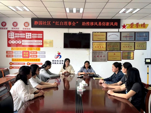 靜園社區(qū)召開紅白理事會(huì) 呂晶 攝 6月17日下午,靜園社區(qū)召開紅白理事會(huì),會(huì)議倡導(dǎo)摒棄陳規(guī)陋習(xí),鼓勵(lì)采用家庭追思、網(wǎng)絡(luò)祭掃、鮮花寄情、撰寫追憶文章、種植紀(jì)念樹等綠色低碳方式寄托哀思。同時(shí),要抵制隨意占道、噪音擾民、破壞社區(qū)環(huán)境秩序的行為,共同維護(hù)社區(qū)安寧祥和的公共空間。