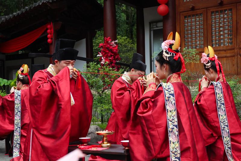 行合巹禮,寓意姻緣一線牽 如今,朱子婚禮逐漸在延平區、建陽區、政和縣等地推廣,引發良好的社會反響。以朱子婚禮為主題的體驗項目吸引眾多游客前來體驗和打卡,成為當地著名民俗文化品牌。(記者 張筱惜 通訊員 陳暢 文/攝) |