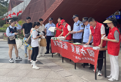 近日,南平市文化和旅游局、武夷山市文化體育和旅游局聯(lián)合福建武夷山旅游發(fā)展股份有限公司、武夷山中信國際旅行社、建陽區(qū)旅游發(fā)展有限公司組建志愿隊伍在武夷山國家公園景區(qū)南路口,開展以“文明旅游,美麗中國”為主題的文明旅游宣傳活動,為持續(xù)推動文明旅游發(fā)展,倡導(dǎo)文明旅游新理念、新風(fēng)尚營造濃厚氛圍。
